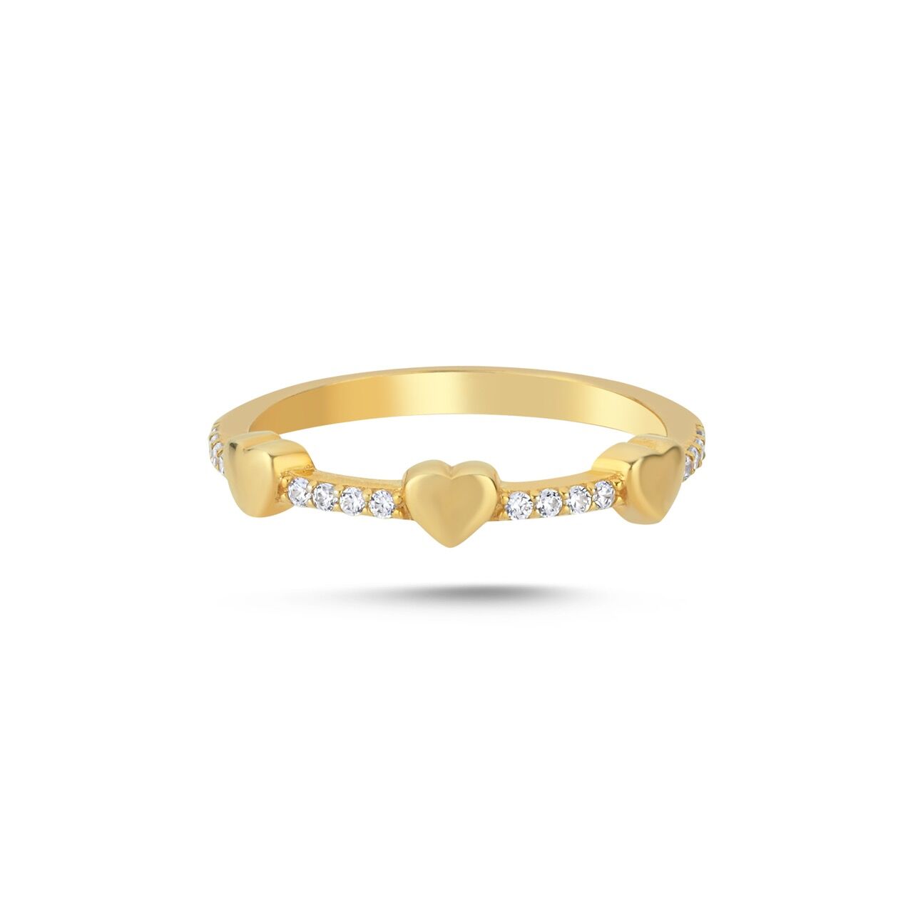 Üç kalp detayı ve ince taş hattıyla: romantik ama “minimal-premium” çizgide, tek başına da güçlü, stack’te de net durur.
