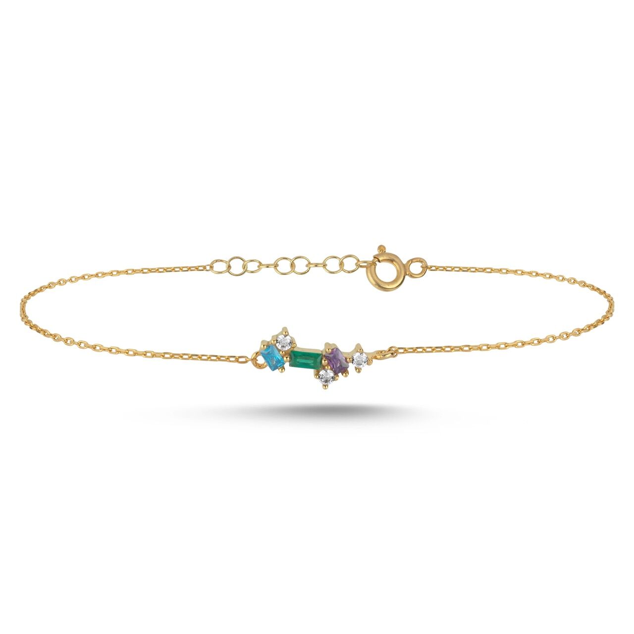 Farklı renklerde taşların dengeli dizilimiyle tasarlanan bu bileklik; uyum, enerji ve kişisel ifadenin modern bir yorumudur. Baguette kesim merkez taşlar net bir çizgi oluştururken, yuvarlak taş detayları tasarıma kontrollü bir ışıltı katar. İnce zincir yapısı bilekte hafif ve zarif bir duruş sunar.