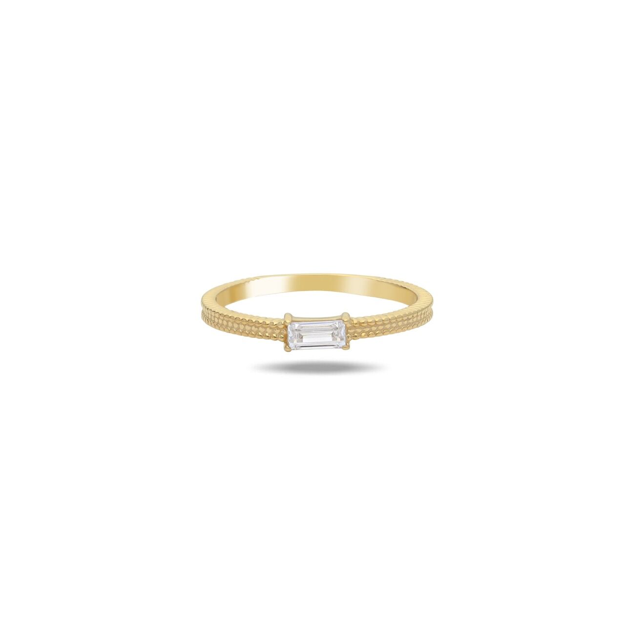 İnce form + milgrain şerit üzerinde yatay baguette taş: tek başına net, stack’te aşırı şık duran “clean luxury” parça.