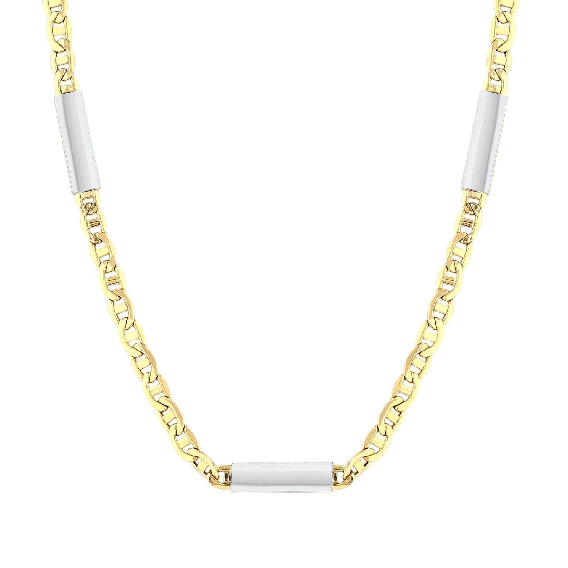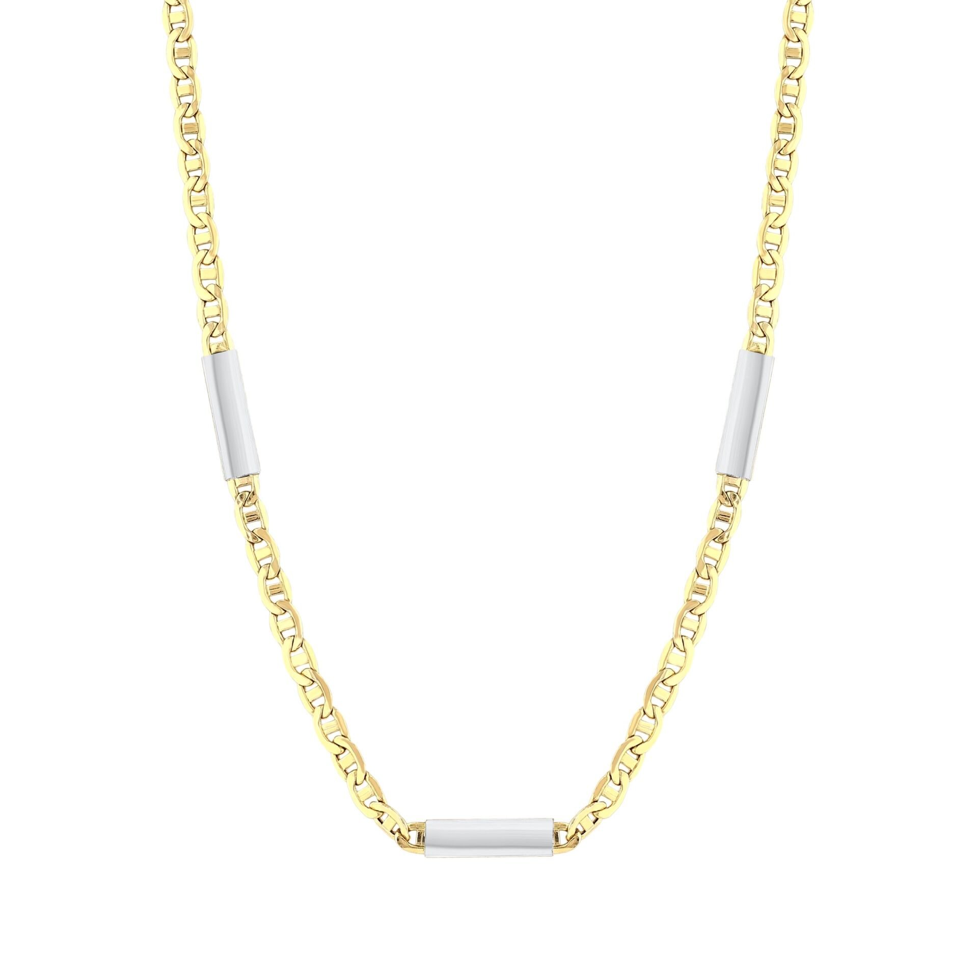 Forse zincirin karakteristik oval ve düz geçişli halka yapısı, merkezde konumlanan silindir form detaylarla modern bir bütünlük kazanır. Dengeli kalınlığı ve akıcı formu sayesinde hem tek başına hem de katmanlı kullanım için uygundur. Parlatılmış yüzeyi ve net hatları, zamansız ve güçlü bir duruş sunar.