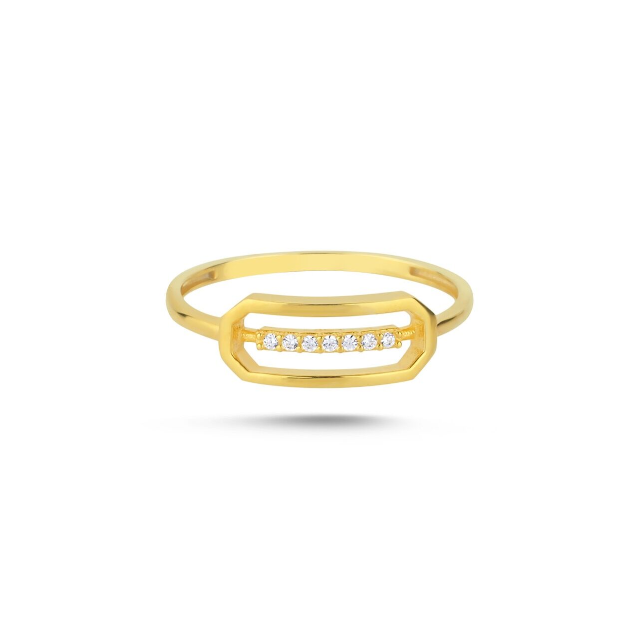 Merkezde yer alan geometrik çerçeve formu ve içinden geçen ince taş dizilimiyle tasarlanan bu yüzük, modern çizgileri net bir zarafetle buluşturur. Minimal ölçekte güçlü bir odak noktası oluşturur; tek başına sade bir ifade sunarken, stacking kombinlerde dengeli bir vurgu yaratır.