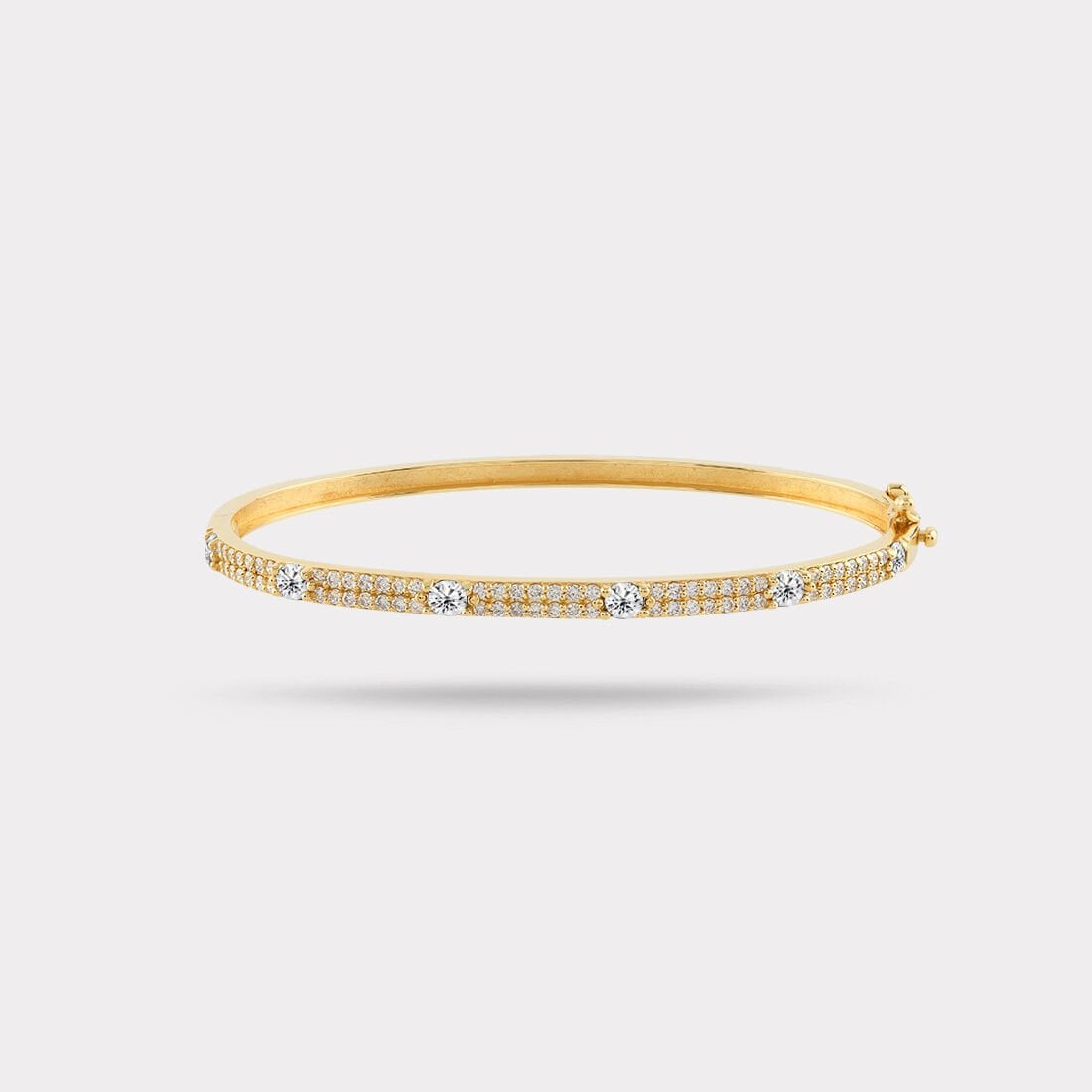 Bilezik hattı boyunca çift sıra pavé taş yerleşimi uygulanmıştır. Belirli aralıklarla konumlanan daha büyük taşlar, ışığı segmentlere ayırır ve tasarıma derinlik kazandırır. Tek parça gibi görünen ama bilinçli olarak bölümlenmiş bir yapı.