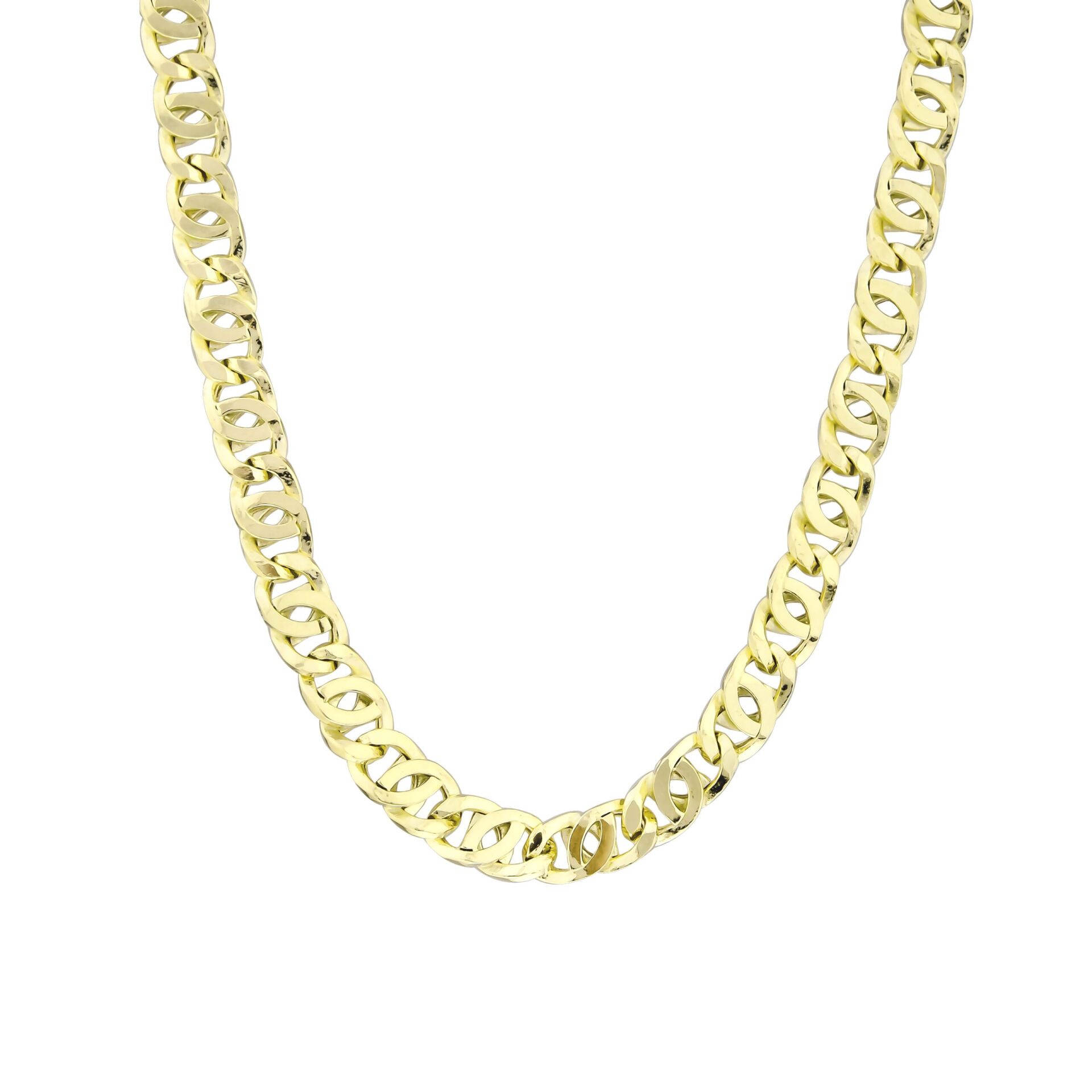 Kaplangözü gurmet zincirin karakteristik geniş ve oval halka formu, güçlü ve dengeli bir görünüm sunar. Yoğun ve hacimli yapısı sayesinde tek başına kullanıldığında dahi belirgin bir etki oluşturur. El işçiliğiyle tesviye ve polisajı tamamlanmış yüzeyi, yüksek parlaklık ve pürüzsüz bir geçiş sağlar. Günlük kullanım ve güçlü kombinler için ideal, zamansız bir zincir kolyedir.