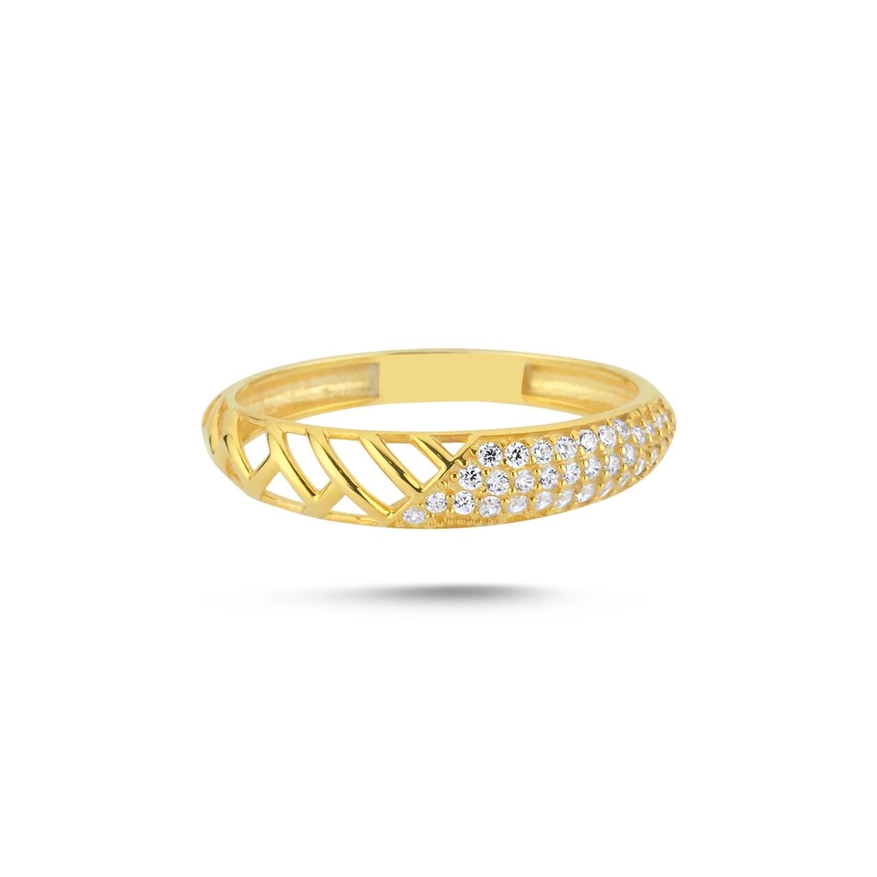 Geometrik boşluklarla oluşturulan açık form, yüzüğe hafiflik ve modern bir mimari kazandırır. Ön yüzeyde yoğunlaşan taş dizilimi, tasarıma kontrollü bir ışıltı eklerken; açık işçilik yapısı ışığın formun içinden akmasına izin verir. Dengeli kontrastı sayesinde hem gündelik kullanımda sade bir ifade sunar hem de tek başına güçlü bir stil tamamlayıcısı olarak öne çıkar.