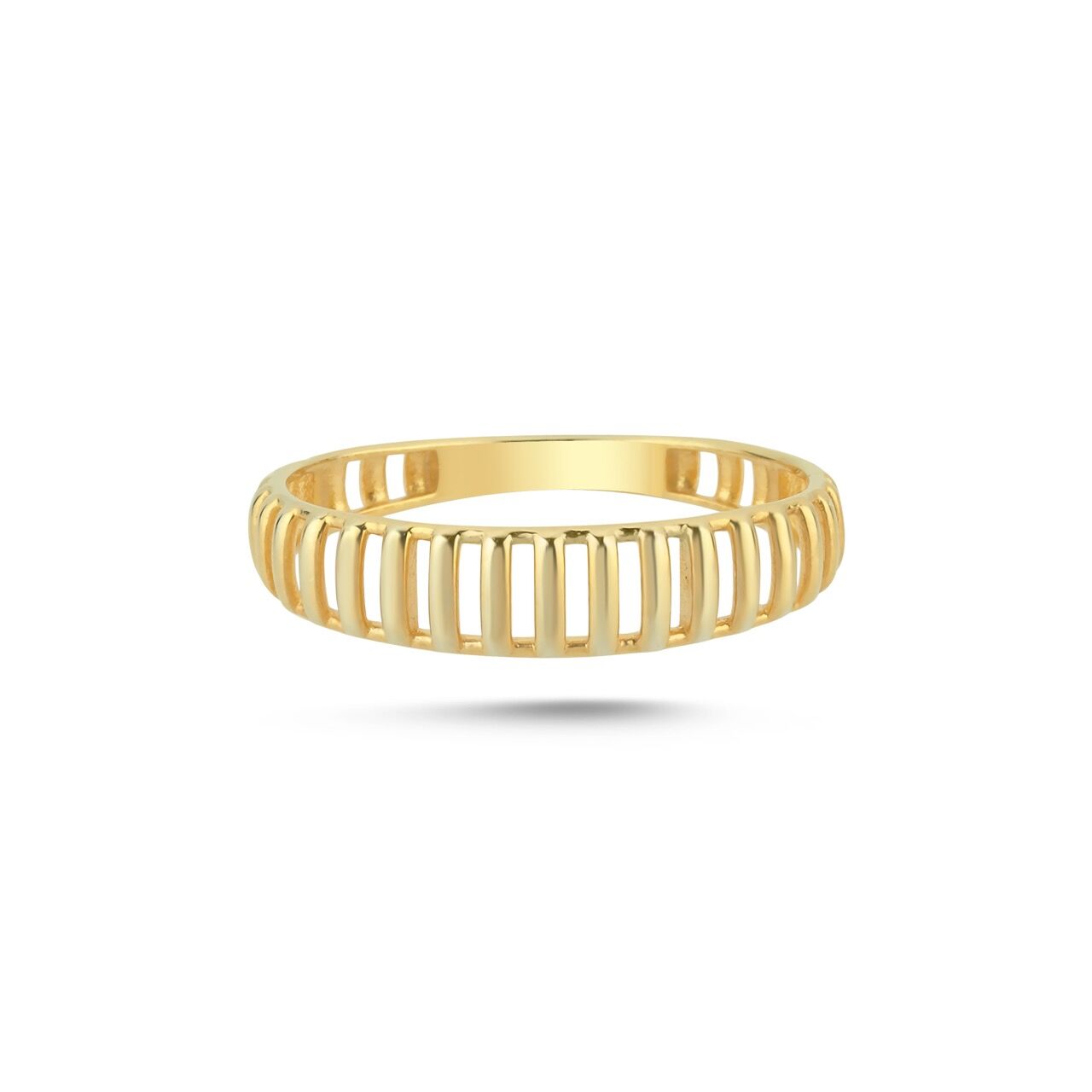 Dış yüzeyinde ritmik dikey boşluklarla şekillenen bu yüzük, sade formu modern bir mimari etkiyle buluşturur. Işığı kontrollü şekilde yansıtan yapısı sayesinde minimal ama karakterli bir duruş sergiler. Tek başına net bir stil sunar, stacking kombinlerde ise güçlü bir tamamlayıcıdır.