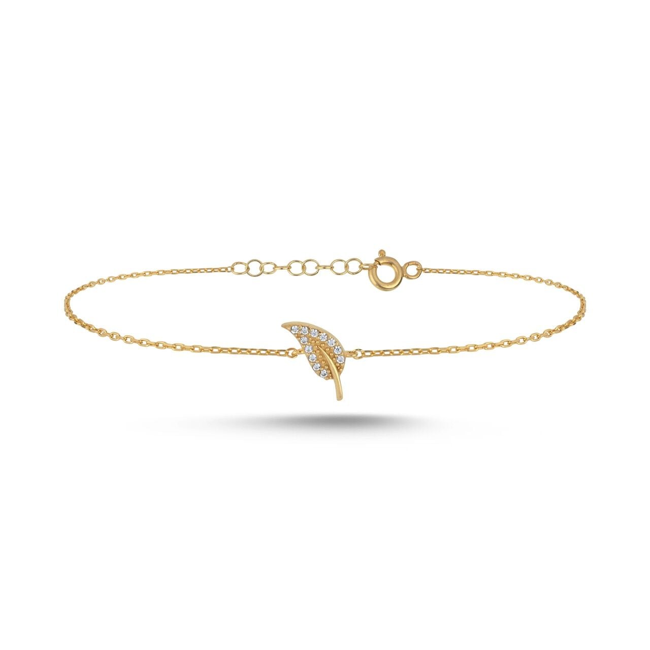 Akışkan bir yaprak formundan ilham alan bu tasarım, merkezde yer alan kavisli silüeti ve yüzeye dengeli şekilde dağılan taş detaylarıyla zarif bir hareket hissi yaratır. İnce zincir yapısı bilekte neredeyse hissedilmezken, asimetrik merkez form bilekliğe modern ve feminen bir karakter kazandırır. Günlük şıklık için güçlü ama abartısız bir tamamlayıcıdır.