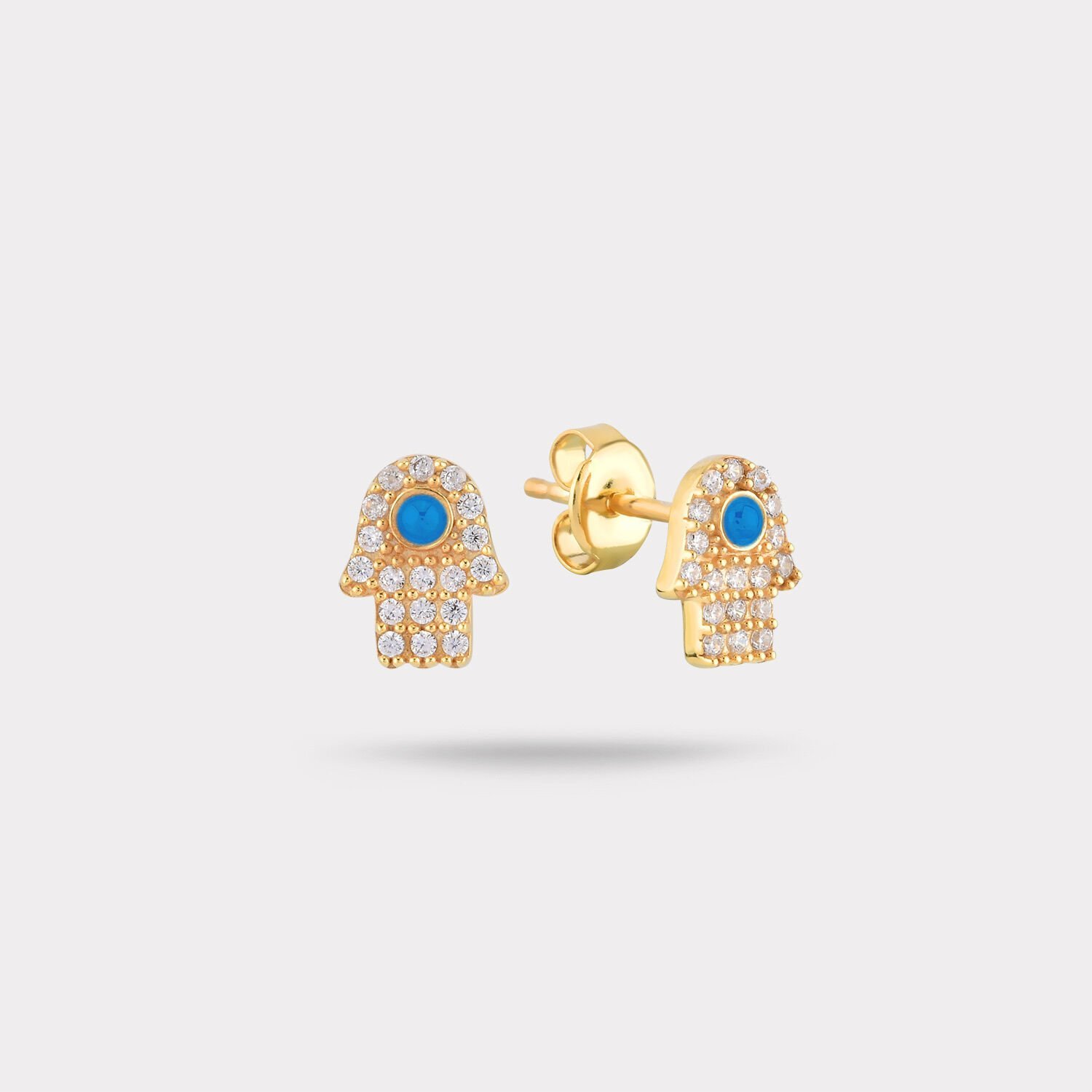 Simgesel el formundan ilham alan bu tasarım, merkezde konumlanan taş detayı ve çevresini saran mikro taş dizilimiyle güçlü bir anlam katmanı sunar. Kompakt ölçülerine rağmen yoğun işçilik barındıran yüzeyi, kulakta net ve dengeli bir ışıltı oluşturur. Günlük kullanımda sade bir imza, özel anlarda ise karakterli bir vurgu arayanlar için tasarlanmış sofistike bir parça.