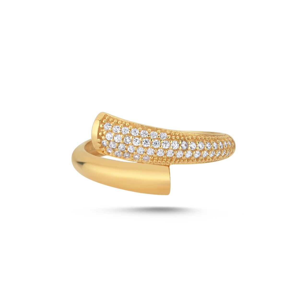 Açık uçlu formda; bir yüzü sade altın, diğer yüzü pavé taş ışıltısı. Minimal çizgide güçlü bir kontrast.