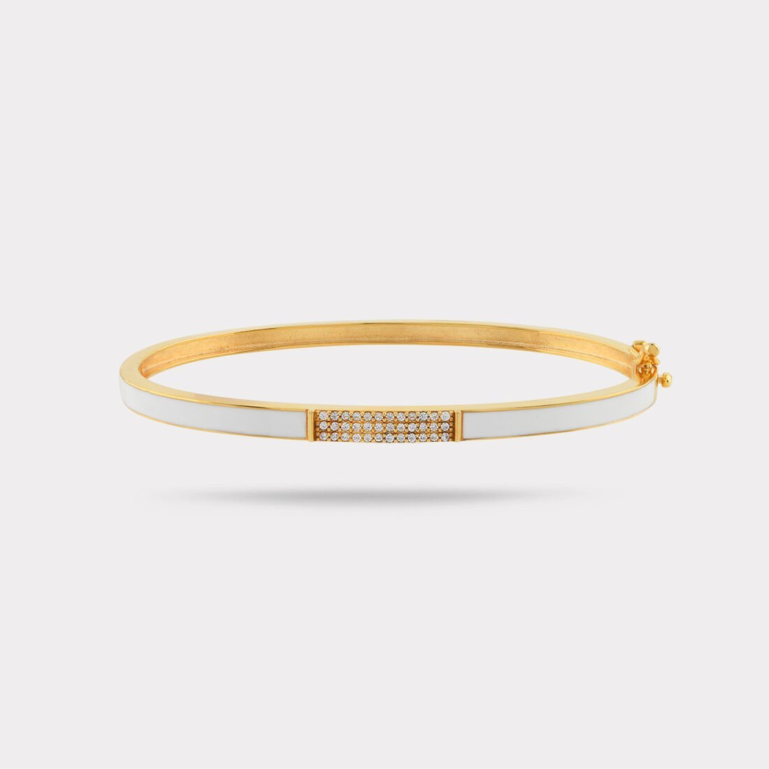 Bilekliğin iki yanına uygulanan beyaz mine, tasarıma temiz ve modern bir karakter kazandırır. Orta bölümde yer alan pavé taş blok, ışığı tek bir odakta toplar. Minimal yüzey – güçlü merkez dengesi.
